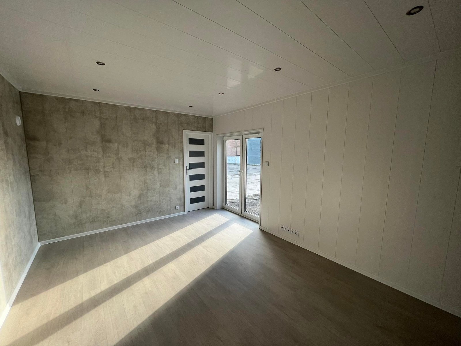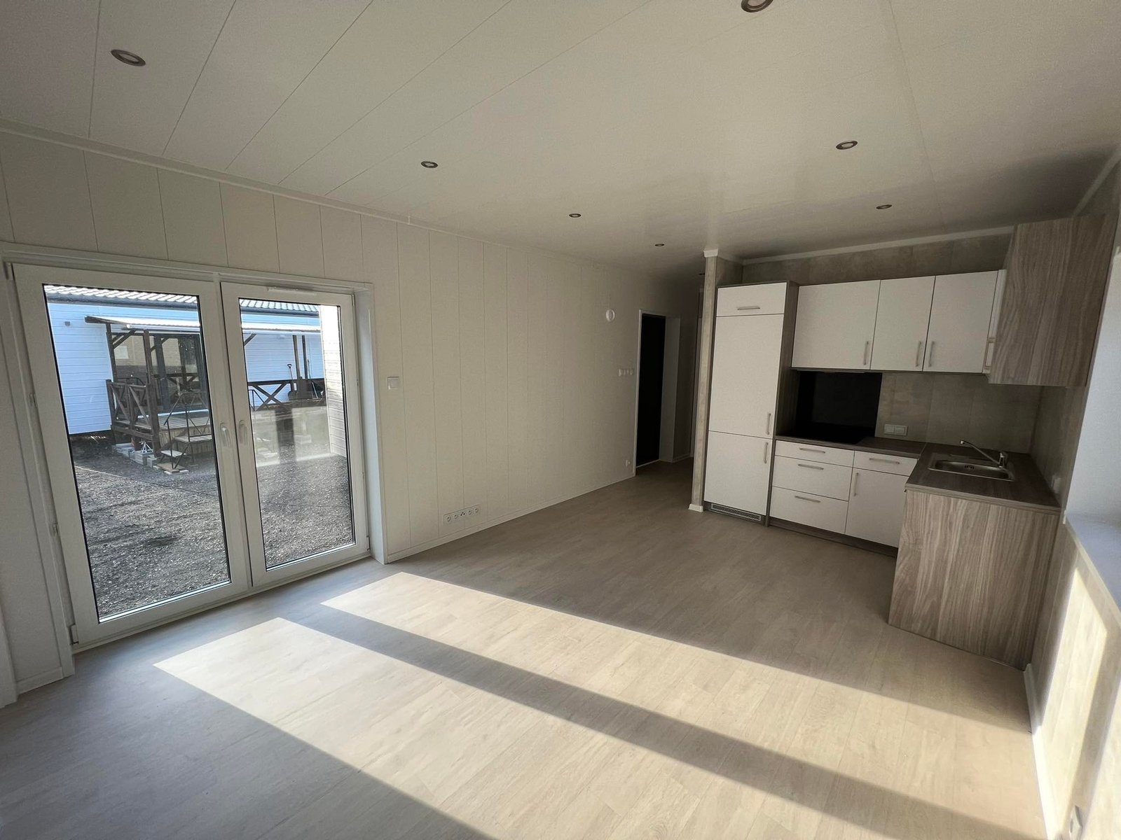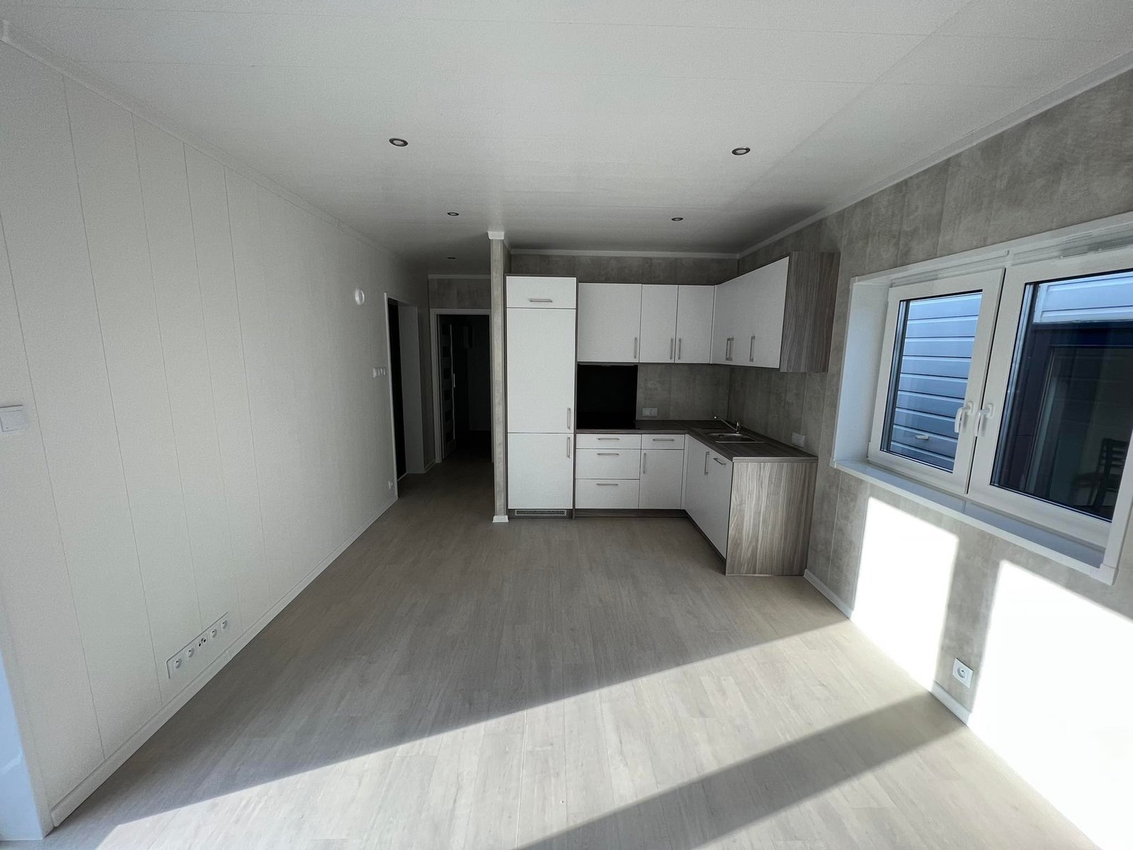 Il comfort è garantito da tre fattori chiave: l’isolamento “Extra Forte” da 20 cm su tutta la struttura, l’installazione di finestre in PVC con triplo vetro per un isolamento acustico e termico assoluto, e un’altezza interna di 2,60 metri che elimina la sensazione di oppressione tipica delle case mobili standard. Gli interni, caratterizzati da pareti effetto cemento e mobili bianchi minimal, offrono uno stile moderno e pulito.