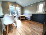 L’estetica interna è il vero punto di forza: il contrasto tra il calore del soffitto a falda e dei pensili in legno con l’eleganza moderna della cucina nera opaca (Matt Black) crea un ambiente sofisticato e accogliente. Le grandi vetrate d’ingresso inondano il soggiorno di luce naturale, collegando armoniosamente interno ed esterno.