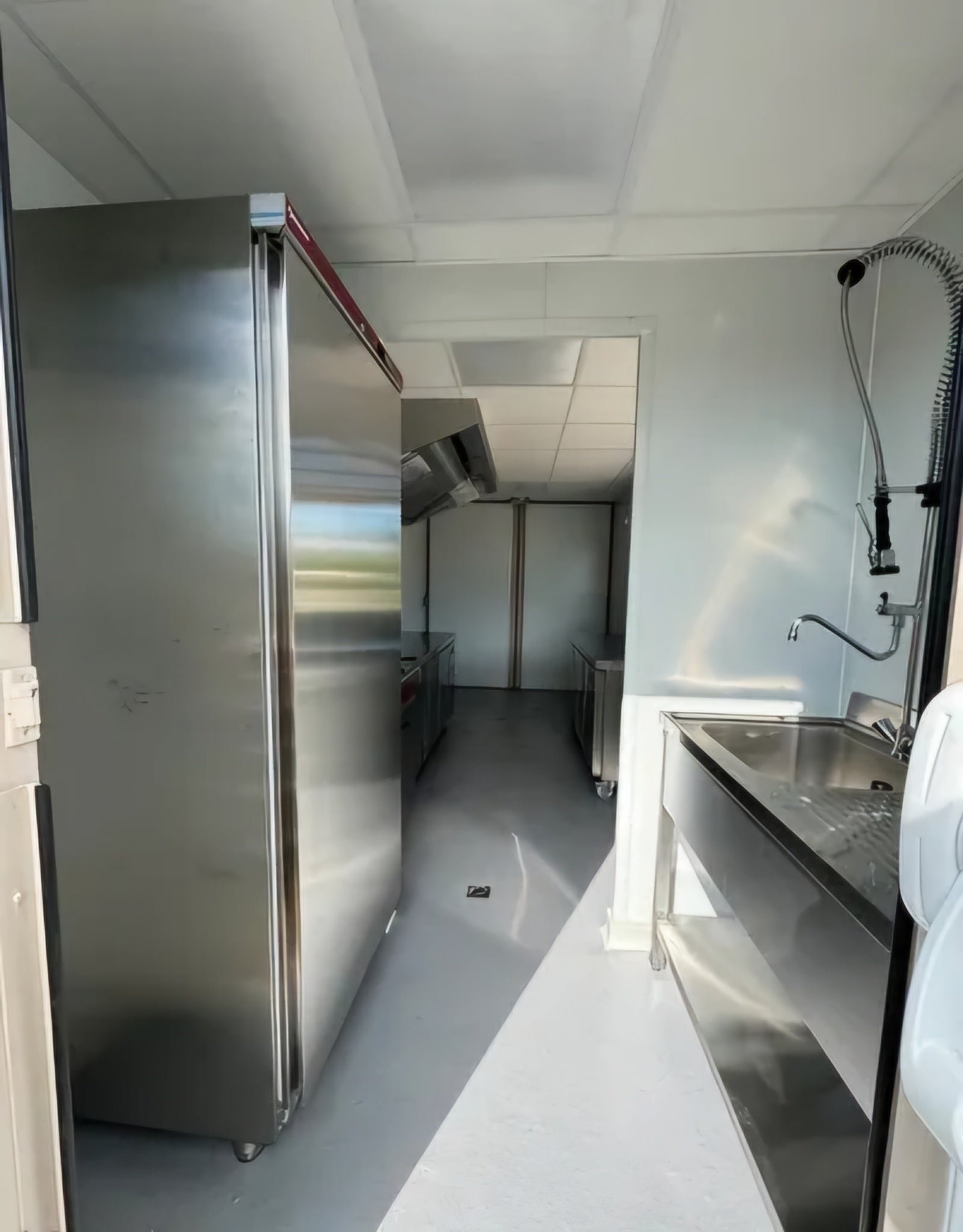La dotazione include cappa aspirante professionale, banchi frigo in acciaio inox, friggitrice e lavello. Ideale per street food, chioschi fissi o cucine da campo.