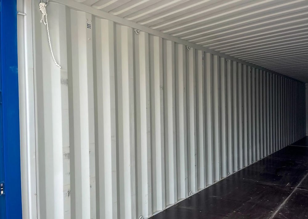 Le immagini mostrano chiaramente le condizioni "One Trip" (Nuovo): la vernice esterna è brillante e priva di corrosione, mentre l'interno rivela un pavimento in compensato marino perfetto e pareti prive di ammaccature. È la base perfetta per magazzini a lungo termine o per conversioni abitative (Tiny House), grazie all'altezza che permette facili coibentazioni del soffitto.