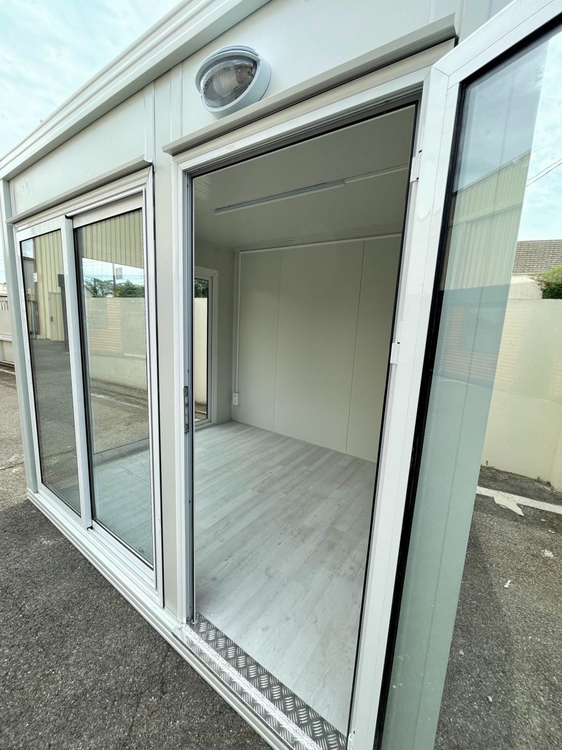 La struttura è solida e ben coibentata: le pareti e il tetto sono realizzati in pannelli sandwich con anima in schiuma di poliuretano (40 mm), rivestiti in lamiera d’acciaio prelaccata bianca. Questo garantisce resistenza all’umidità, isolamento dal freddo e una manutenzione praticamente inesistente nel tempo. I serramenti in alluminio con doppi vetri assicurano inoltre un buon isolamento acustico.