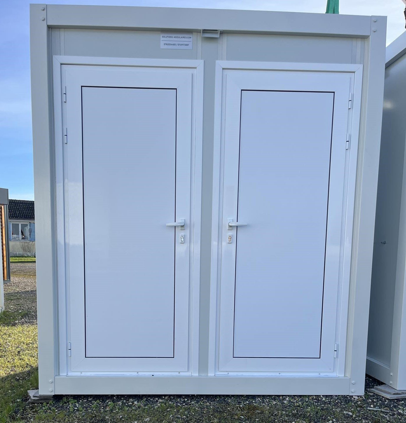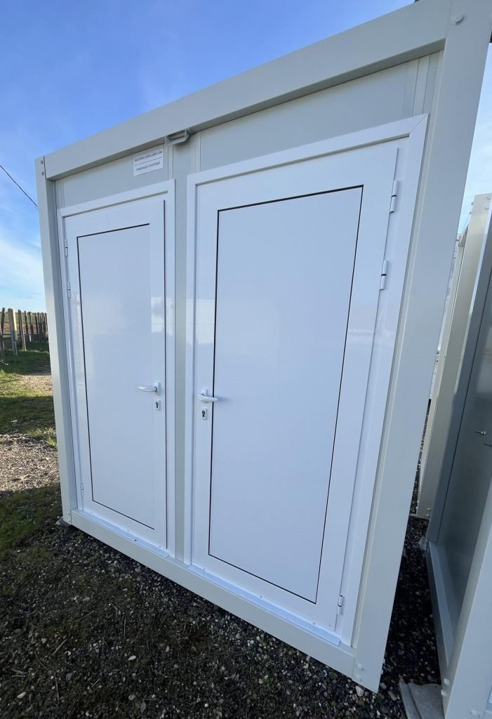 Il Modulo Sanitario Prefabbricato a 2 Cabine è progettato per offrire servizi igienici durevoli, igienici e pronti all'uso. La struttura è divisa in due vani indipendenti, ciascuno con la propria porta di accesso in alluminio, rendendolo perfetto per la distinzione dei servizi (es. Uomo / Donna o Personale / Pubblico).