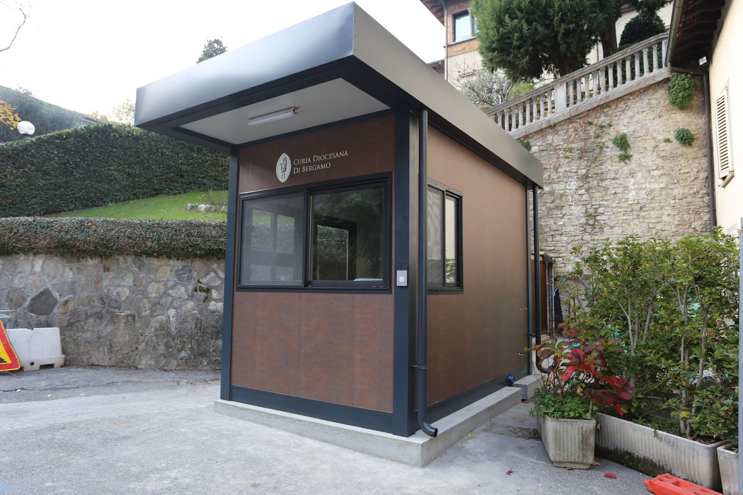 Il biglietto da visita della tua azienda. Il Monoblocco Portineria Premium “Design Corten” non è un semplice box, ma un elemento architettonico di prestigio. Con dimensioni di 393 x 243 cm, offre una postazione di controllo lussuosa e confortevole.