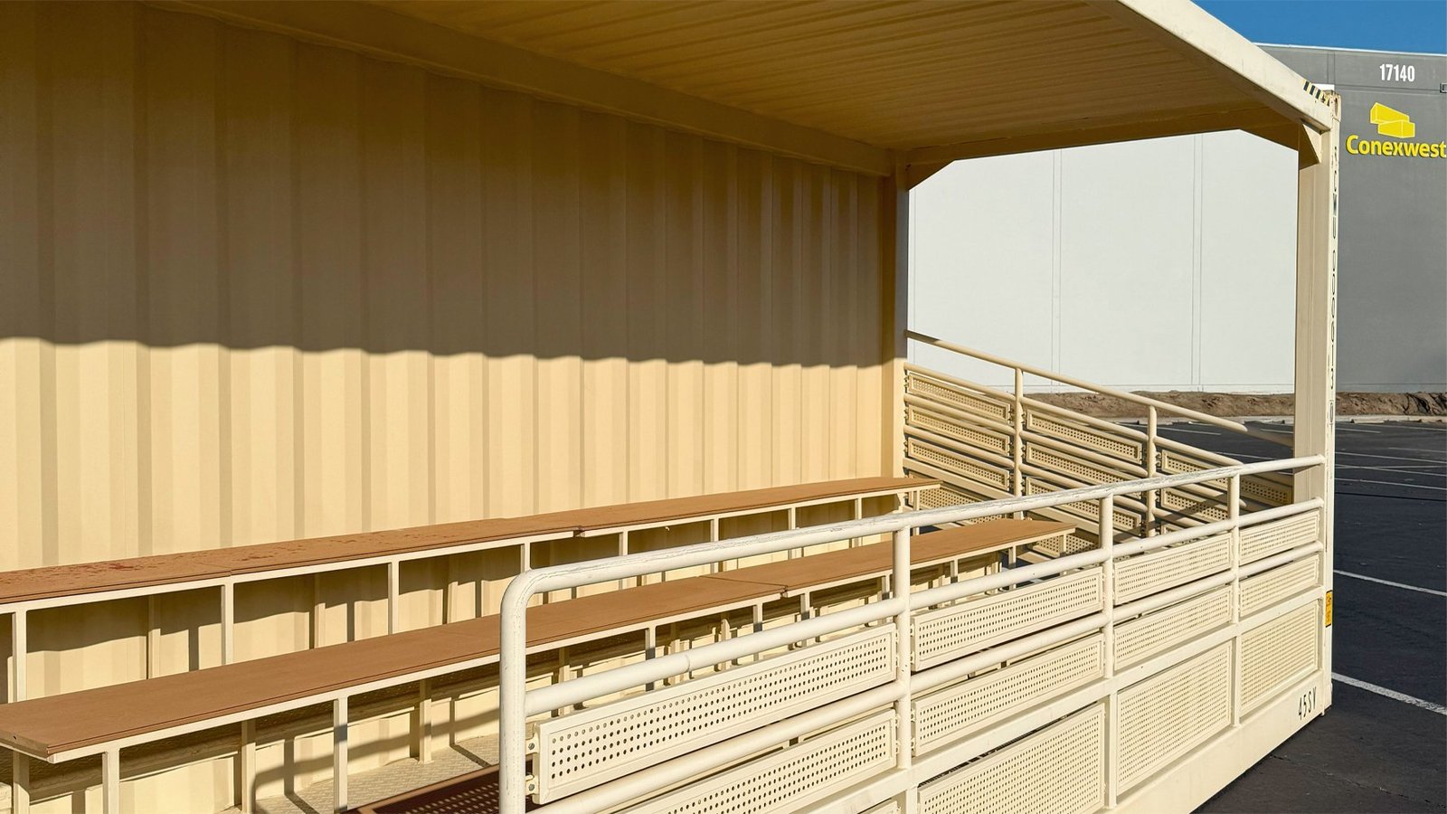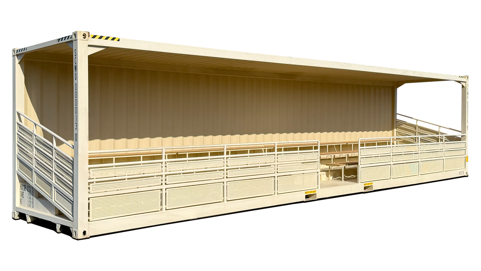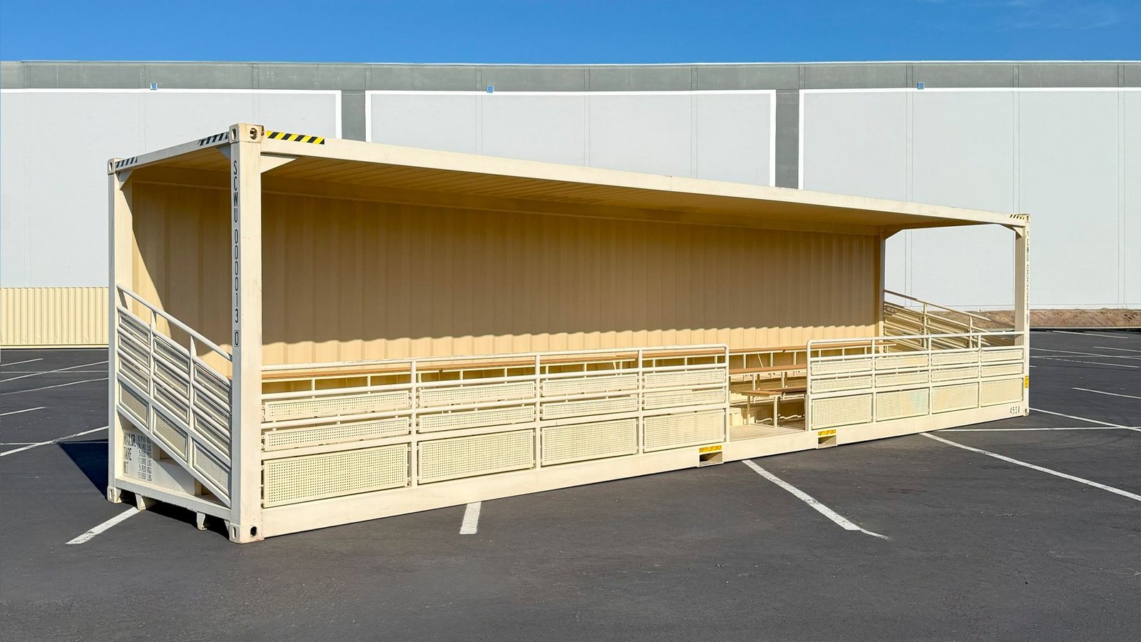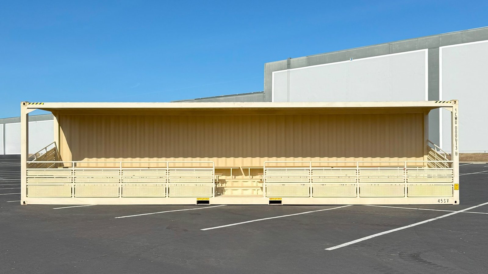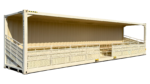 Il sistema è unico nel suo genere: quando aperta, offre gradinate su più livelli con ringhiere di protezione; quando chiusa, appare come un normale container di spedizione, impermeabile e sicuro. Questo elimina i costi di stoccaggio esterno e protegge le sedute dall’usura quando non utilizzate. È la soluzione definitiva per chi necessita di posti a sedere flessibili, robusti e immediatamente operativi.